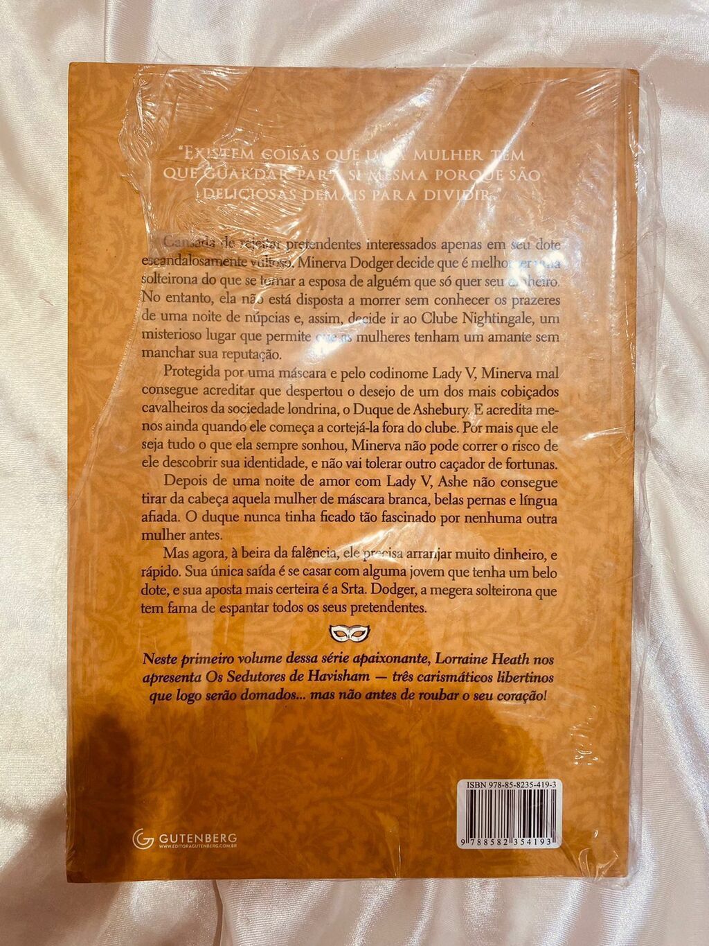 Cansada de rejeitar pretendentes interessados apenas em seu dote escandalosamente vultoso, Minerva Dodger decide que é melhor ser uma solteirona do que se tornar a esposa de alguém que só quer seu dinheiro. No entanto, ela não está disposta a morrer sem conhecer os prazeres de uma noite de núpcias e, assim, decide ir ao Clube Nightingale, um misterioso lugar que permite que as mulheres tenham um amante sem manchar sua reputação.Protegida por uma máscara e pelo codinome Lady V, Minerva mal consegue acreditar que despertou o desejo de um dos mais cobiçados cavalheiros da sociedade londrina, o Duque de Ashebury. E acredita menos ainda quando ele começa a cortejá-la fora do clube. Por mais que ele seja tudo o que ela sempre sonhou, Minerva não pode correr o risco de ele descobrir sua identidade, e não vai tolerar outro caçador de fortunas.Depois de uma noite de amor com Lady V, Ashe não consegue tirar da cabeça aquela mulher de máscara branca, belas pernas e língua afiada. Mesmo sem saber quem ela é, o duque nunca tinha ficado tão fascinado por nenhuma outra mulher antes.Mas agora, à beira da falência, ele precisa arranjar muito dinheiro, e rápido. Sua única saída é se casar com alguma jovem que tenha um belo dote, e sua aposta mais certeira é a Srta. Dodger, a megera solteirona que tem fama de espantar todos os seus pretendentes.